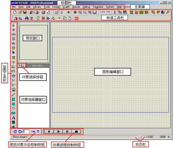 Proteus ISIS的工作界面是一种标准的Windows界面,如图所示。包括:标题栏、主菜单、标准工具栏、绘图工具栏、状态栏、对象选择按钮、预览对象方位控制按钮、仿真进程控制按钮、预览窗口、对象选择器窗口、图形编辑窗口。