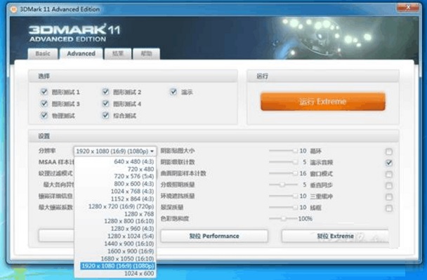 高级标签页:可选择测试场景和参数设置细节,并随时恢复预设级别
