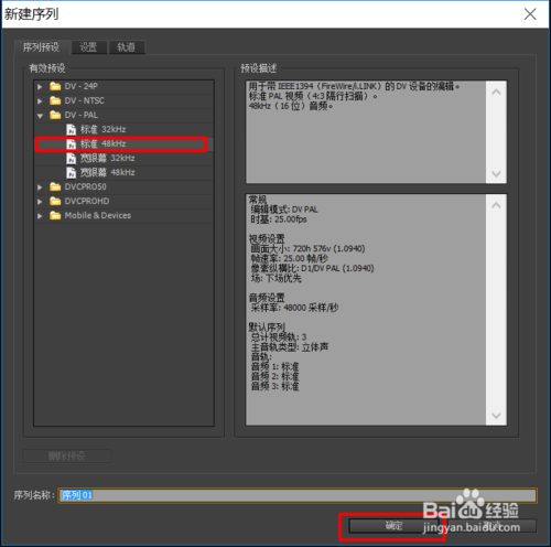 在新建序列中,一般默认选择,也可以根据自己的需要选择,最后点击确定