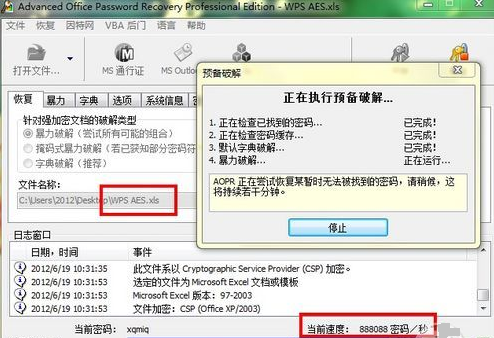 双击桌面上的图标打开AOPR软件,鼠标单击左上角的“打开文件”按钮,打开之前设置好密码的Excel文档,此时系统会自动运行准备攻击。如果你的电脑配置够强大,AOPR版本更高级,就可以很快地把密码破解出来。