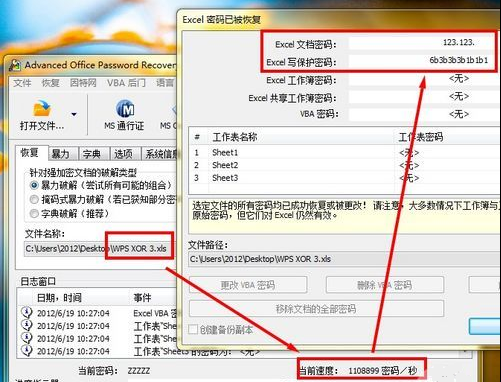提示:3个字符以内的密码,Excel密码破解工具AOPR试用版可以立即破解,将Excel的账簿密码显示在结果对话框中。
