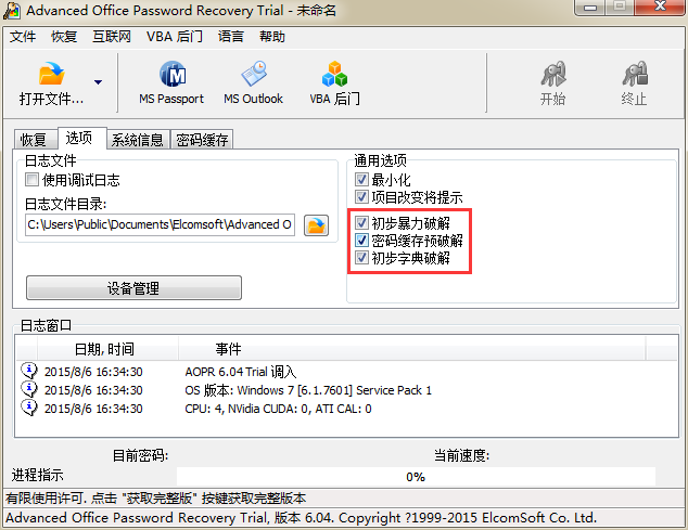 3.自动开始用字典模式破解(软件已经录入的一些常规密码,逐个尝试)。这时 Office密码破解工具会自动开始破解密码,先执行初步破解,如果密码设置简单,那么可以很快找到密码。但是大部分可能下是找不到密码的。