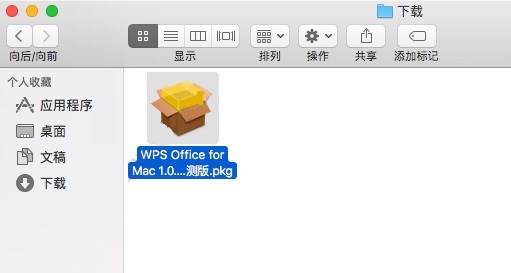 1、从本站下载完软件资源包之后,将其解压出来,您将会得到一个名为“WPS Office for Mac 1.0.0 133 内测版.pkg”的可运行程序文件,我们双击将它打开运行