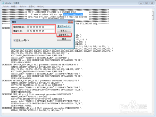把他替换成计算机的物理地址,至于如何查看计算机的物理地址我这里就不多说了自己到网上去查,,替换后要点击全部替换区分大小写,完成后如下图:保存一下