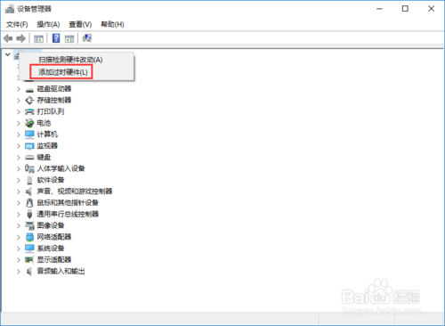 打开设备管理器,在最上面一行右击,选择添加过时硬件