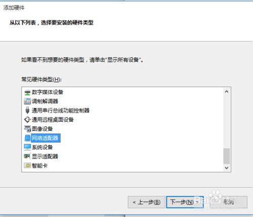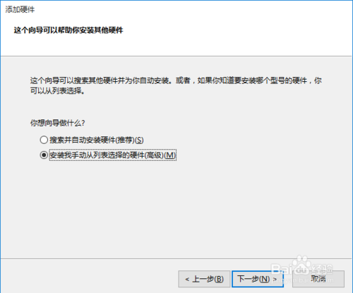 弹出添加硬件向导窗口,选择下一步,选择安装我手动从列表选择的硬件,下一步