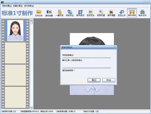 而且这款软件还有着图像质量检查的能力,如果质量有问题,如没有去处皮肤上的高光,我们点击“照片保存”,那就会跳出以下对话框“图像质量警告”,上面明确的告诉我们存在什么问题还有怎么解决,当然也可以选择不解决这个问题。这个功能还是非常人性化的。