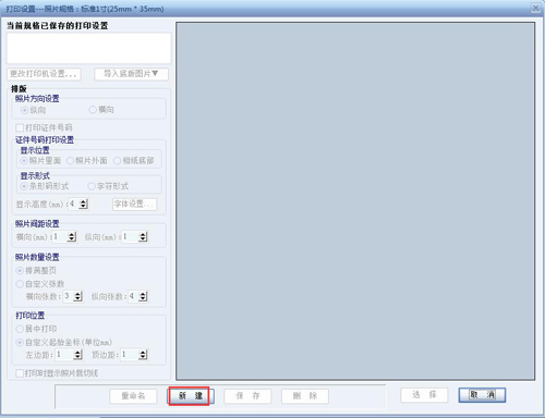 点击工具栏上“打印设置”工具按钮,打开“打印设置-照片规格:标准1寸证照”对话框。点击“新建”按钮,如果本机连接有打印机选择“本地打印,”否则选择“送至冲印”,在这里选择“送至冲印”,选择纸张名称,点击“确定”。然后按照自己的需求设置排版,点击“保存”,输入保存名称,点击“选择”。