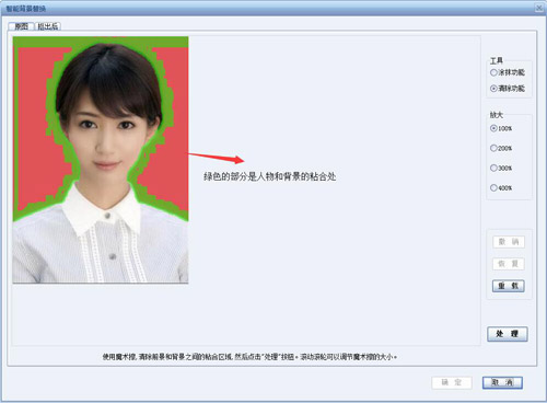 这是因为在点击“处理”按钮之前,没有用魔术擦,涂人物和背景之间的沾合区域,或者涂了,但是没有涂满。用魔术擦涂满前景和背景之间的粘合区域,然后点击“处理”按钮,点击“背景颜色”或“背景图片”按钮,选好后单击确定按钮,即可成功替换背景。