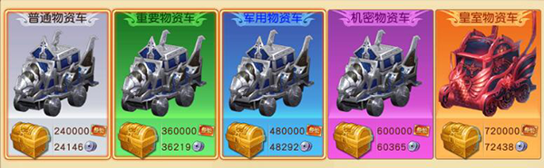 在粮草先行任务中,物资车有5种不同的档次:普通,重要,军用,机密,皇室,物资车的档次越高,玩家完成任务时所获得的经验越高。
