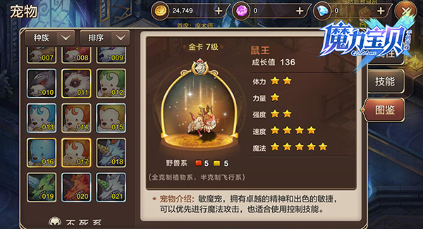 点开界面右下角的“封印”按钮,可以查询当前等级可以前往捕捉的宠物和所在地图,每个宠物界面都会显示你所拥有的封印卡数量和封印概率。普卡、银卡封印卡分别封印普卡、银卡宠物的概率会随着宠物阶级也就是图鉴卡等级的提高而降低,而金制、银制封印卡封印所有普卡宠物都是必中。值得一提的是,宠物强度越高,封印难度越高。