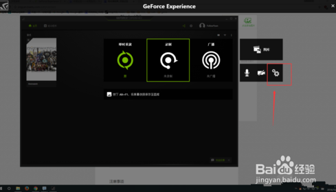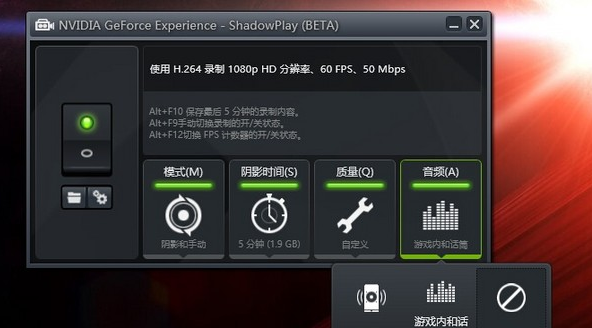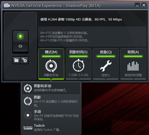 1.打开NVIDIA Geforce experience,点击右上角的“ShadowPlay”打开录制工具。点击左侧的开关按钮,将其保持在激活状态,接着选择模式。模式分为:阴影和手动、阴影、手动和Twitch。在这里我们选择手动模式,方便随时开始和结束录制。
