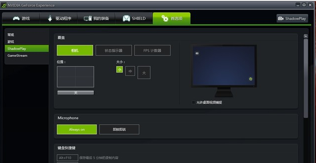 5.有的用户会对摄像头、FPS显示以及麦克风按键说话进行设置,这可以在“首选项-shadowplay”中进行设置。