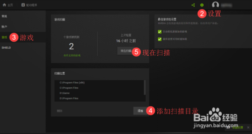 请检查您的游戏是否支持最优设置。您可以在“Settings”(设置)—>“Games”(游戏)选项卡上告诉 GeForce Experience 从何处查找游戏。添加游戏的安装位置,然后单击“Scan now”(立即扫描)以重新扫描。