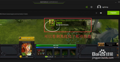 把鼠标放到游戏界面上,会出现绿色的方框,可以看到GeForce Experience对游戏优化哪些性能