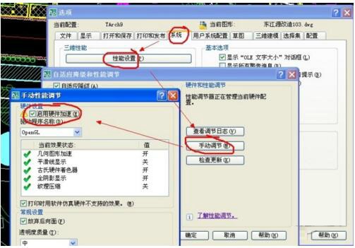 1、工具->选项>系统,点性能设置在弹出的对话框中点击“手动调节” ,在弹出的对话框中勾上硬件加速即可。