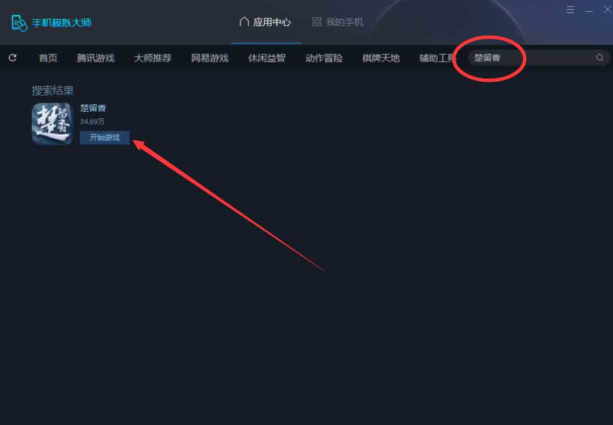 5.搜索出来之后,点击开始游戏,就会自动安装并运行。之后在“我的手机”标签就可以看到。如果应用中心没有搜到,还可以去对应游戏和App官网下载到电脑,然后按住安装包拖动到“我的手机”已安装App区域进行安装。