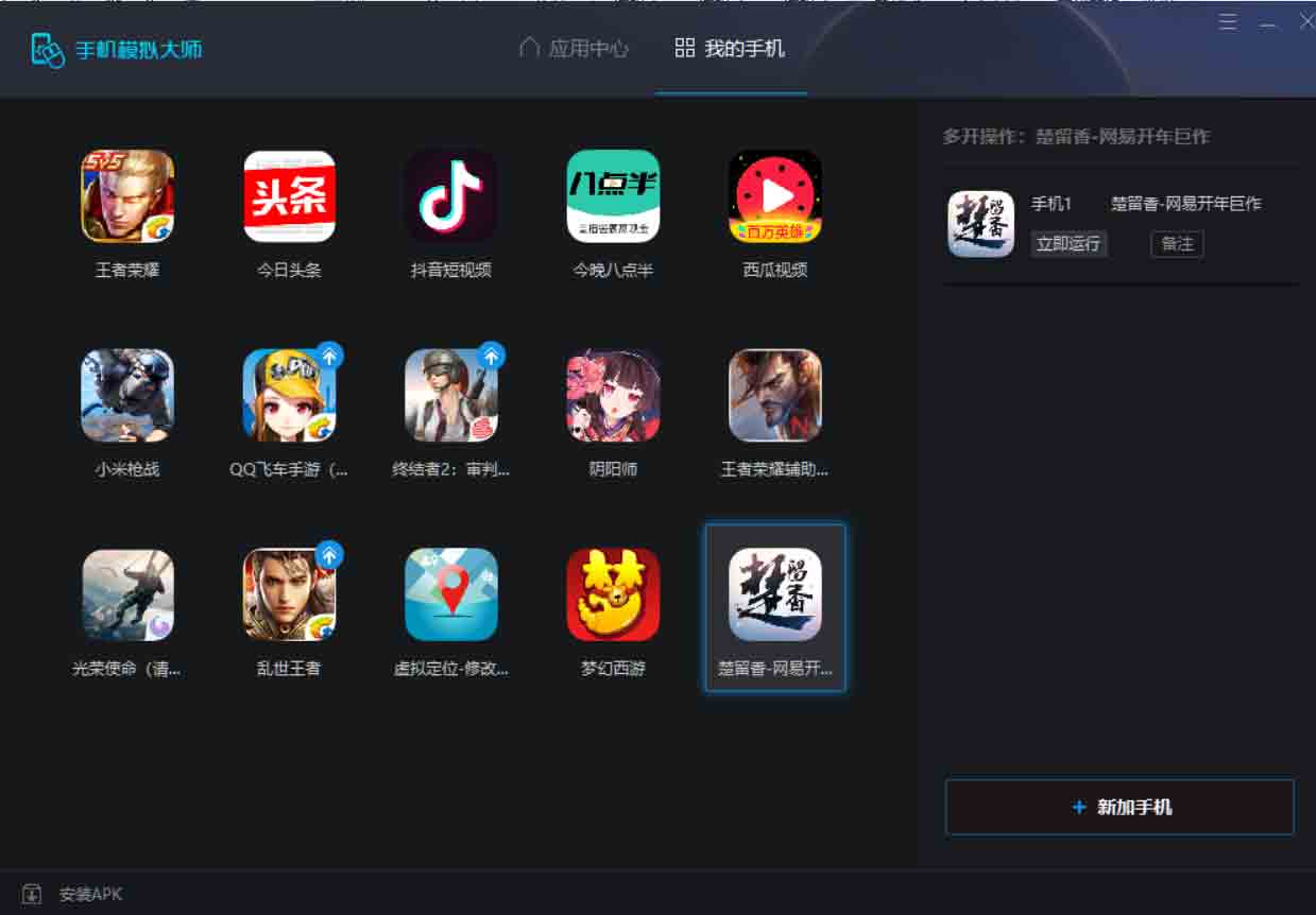 1.游戏安装完成,点击我的手机,会看到已经安装的游戏。右下角有个新加手机。可以依次添加多个模拟手机进行多开游戏。