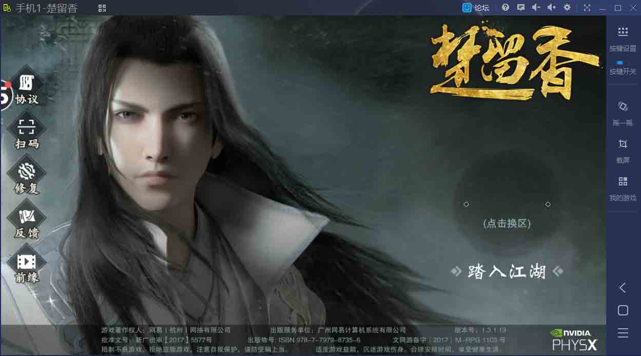 7.点击立即运行之后会启动模拟手机。左上角是模拟手机编号和当前运行应用名称。顶部有论坛、帮助、联系客服、音量增减、模拟手机设置按钮、全屏显示按钮(快捷键F11)。右侧有按键设置、按键开关、摇一摇、截屏和我的游戏按钮。