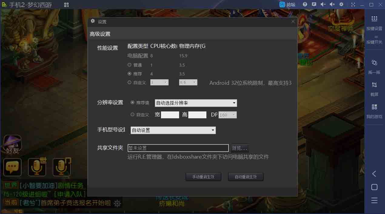 3.如果多开需要调节分辨率和各个模拟手机的内存占用,可以点击右上角齿轮“设置”。里面可以对模拟手机的内存占用、分辨率、模拟手机的型号,以及电脑和模拟手机互通的“共享文件夹”进行自定义。