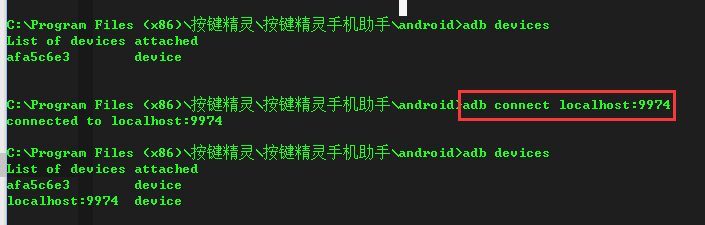 4.如果提示List of devices attached 连接成功,如上图所示。请打开按键精灵手机助手重新扫描下,就可以了。