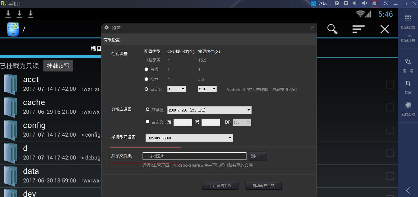 首先,需要进入手机1,在右上角设置里面选择共享文件夹,设置共享文件的位置,设置成功后,需要重启才能生效如:图一