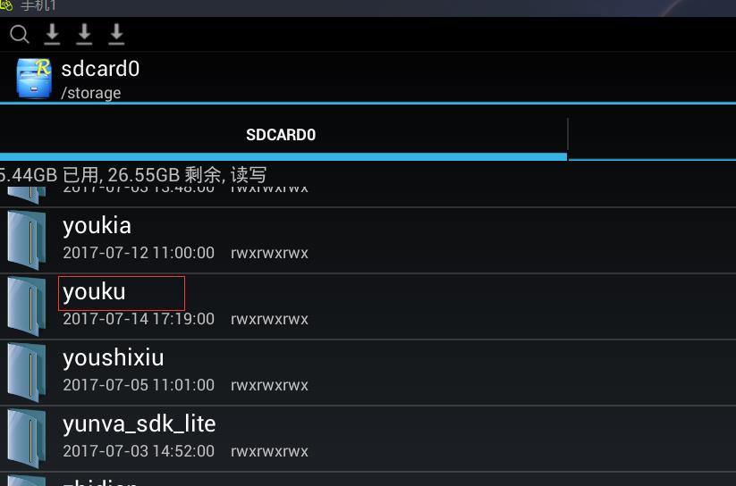 在sdcard(图三)或者是storage/sdcard0(图四)找到对应APP的名称,比如优酷显示是:youku;(图五)