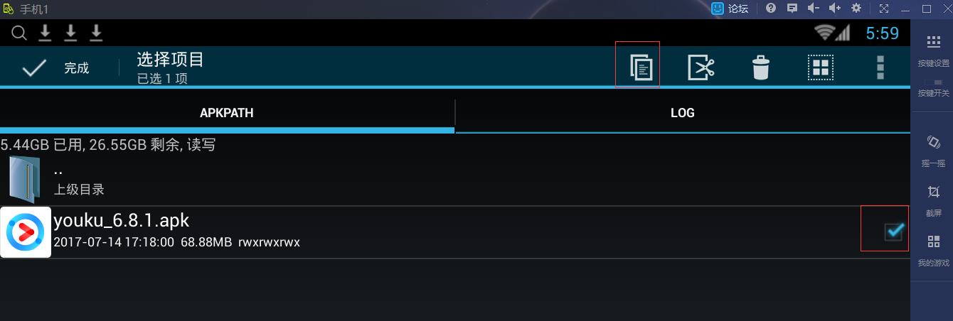当我们找到文件位置之后,这边使用优酷的APK文件举例,选中对应的文件,然后在上方点标红的图标(图6) ,
