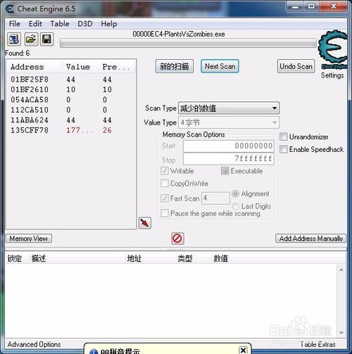 22、回到CE主界面,搜索“要查找的地址指针的值可能是多少多少”中的那个数。注意要勾上前面的Hex,点击两下“新的扫描”。