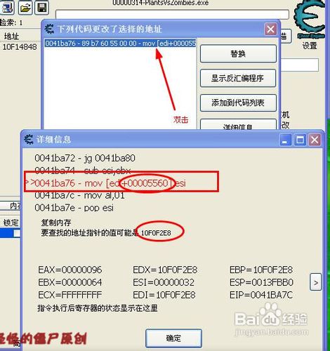 21、回到CE。注意框里有东西出来了。双击,查看详细信息,记下红字中的“edi+00005560”其中“00005560”就是偏移。再记下“要查找的地址指针的值可能是多少多少”中的那个数。