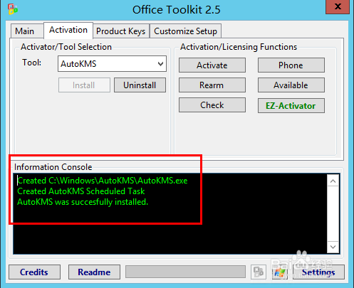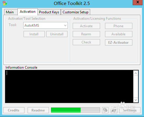 注:Microsoft Toolkit 在这些操作系统上可以激活 Windows 8.1/Server 2012 R2 或 Microsoft Office 2013!这是一组工具和功能来管理授权,部署和激活 Microsoft Office 和 Windows。所有的这些功能输出显示在控制台的信息。所有功能都在后台运行,并在 GUI 禁用,以防止运行多个功能,如果同时运行,他们可能会出现冲突或造成损坏。 Microsoft Office 安装自定义功能(自定义安装程序选项卡),AutoKMS 卸载程序(如果安装了AutoKMS),AutoRearm 卸载程序(如果安装了 AutoRearm),办公卸载和产品密钥检查,即使没有安装 Microsoft Office 或 Windows/支持工作。欲知有关各个功能的信息,请参阅该程序的自述。