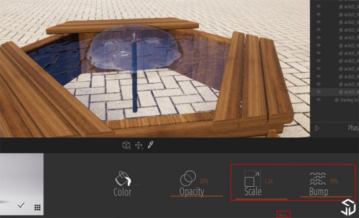 Twinmotion2018中提供一系列极其逼真的PBR(物理渲染)材质。该材质会适应夜晚和日间的光照,做出真实的物理反应。同时,您可以设置材质的颜色、反射率、尺寸等等。所有的设置都通过滑竿进行,非常简单。