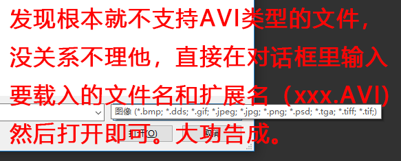 发现不支持avi类型文件,忽视它,直接在对话框输入文件名和扩张名(xxx.AVI),然后打开即可