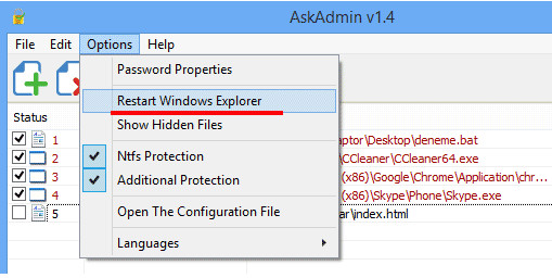 注:如果您使用AskAdmin的“重新启动Windows资源管理器”(在选项菜单),Windows资源管理器将具有管理权限的推出(上NT6系统,如果启用UAC)