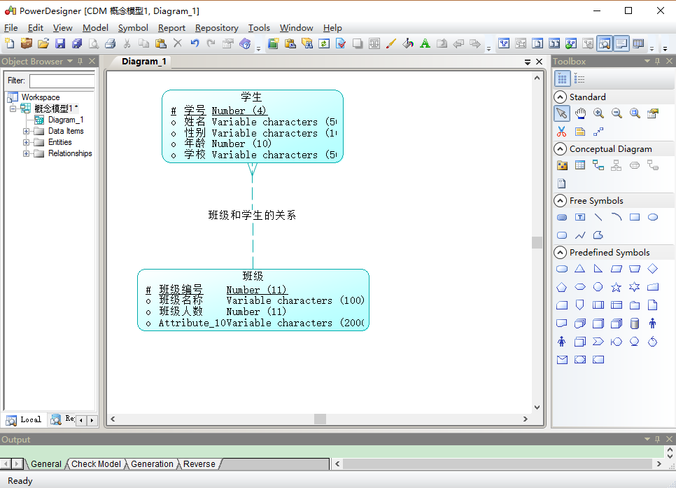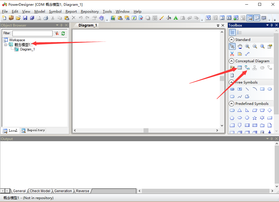 3:点击上面的ok,即可出现下图左边的概念模型1,自己起得概念模型的名字,使用最多的就是如图所示的那两个Entity(实体),Relationship(关系)