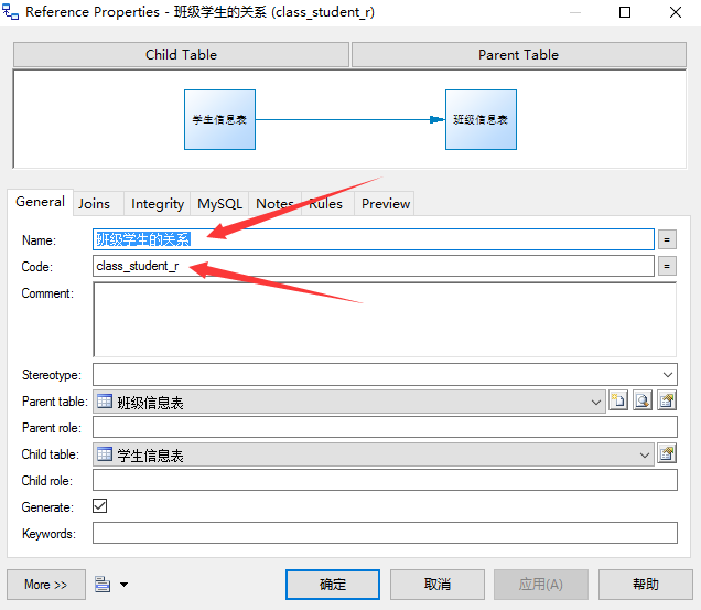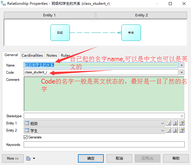 (需要注意的是点击Relationship这个按钮,就把班级和学生联系起来了,就是一条线,然后双击这条线进行编辑,在General这块起name和code)