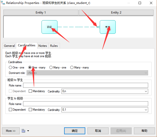 (上面的name和code起好后就可以在Cardinalities这块查看班级和学生的关系,可以看到班级的一端是一条线,学生的一端是三条,代表班级对学生是一对多的关系即one对many的关系,点击应用,然后确定即可)