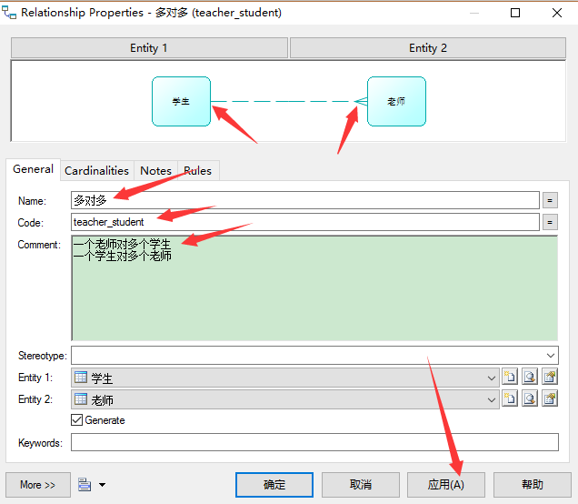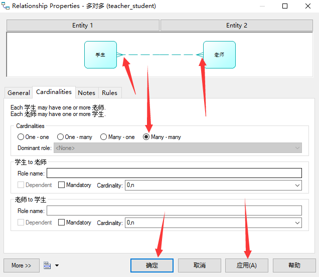 (多对多需要注意的时自己可以手动点击按钮将关系调整称为多对多的关系many对many的关系,然后点击应用和确定即可)