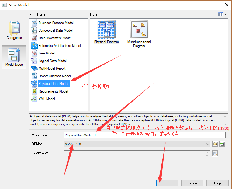 (物理数据模型的名字自己起,然后选择自己所使用的数据库即可)
