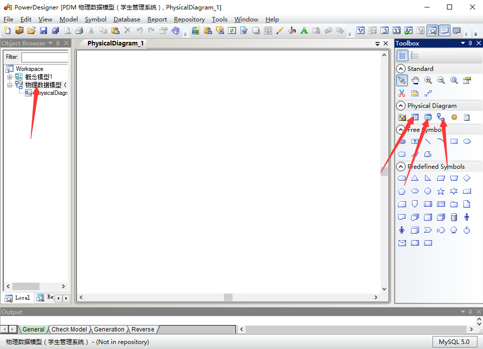 (创建好主页面如图所示,但是右边的按钮和概念模型略有差别,物理模型最常用的三个是table(表),view(视图),reference(关系));