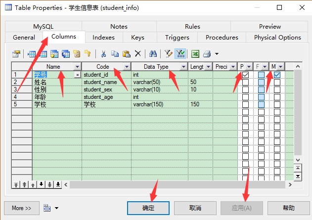 (然后点击Columns,如下图设置,灰常简单,需要注意的就是P(primary主键) , F (foreign key外键) , M(mandatory强制性的,代表不可为空) 这三个,多看几遍理解其意思。)