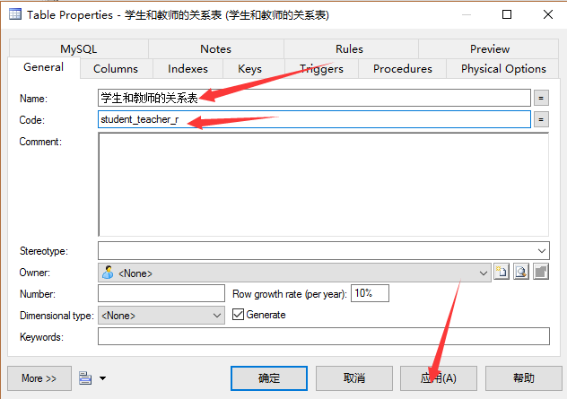 (鼠标先点击右边table这个按钮然后在新建的物理模型点一下,即可新建一个表,然后双击新建如下图所示,在General的name和code填上自己需要的,点击应用即可),如下图: