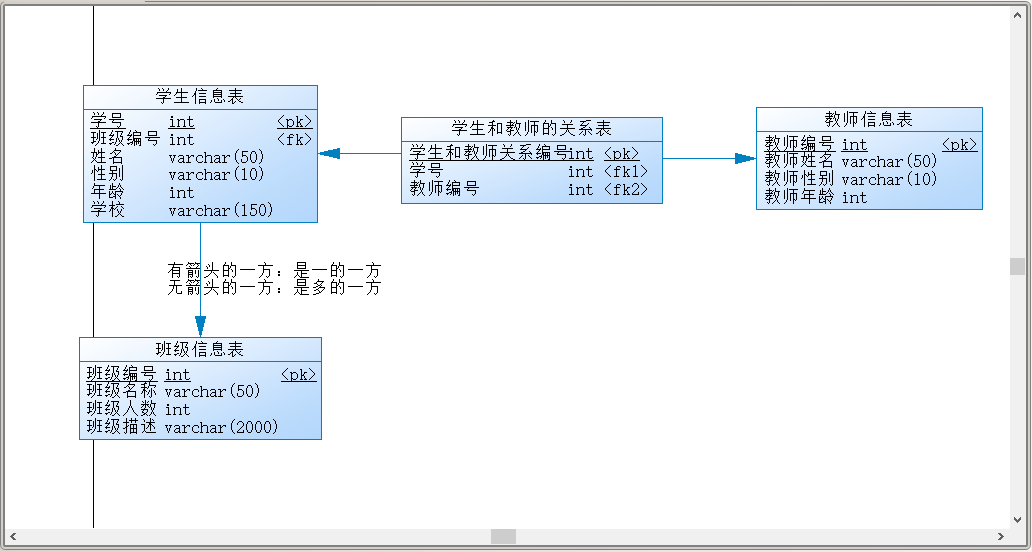 (设置好后如下图所示)(需要注意的是有箭头的一方是一,无箭头的一方是多,即一对多的多对一的关系需要搞清楚,学生也可以有很多老师,老师也可以有很多学生,所以学生和老师都可以是主体,即男/女猪脚);