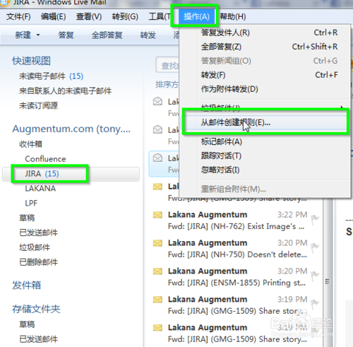 2、在上方的工具栏中选择"操作"-->"从邮件中创建邮件规则".