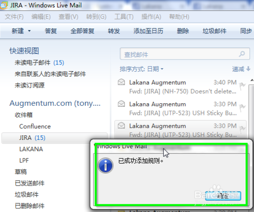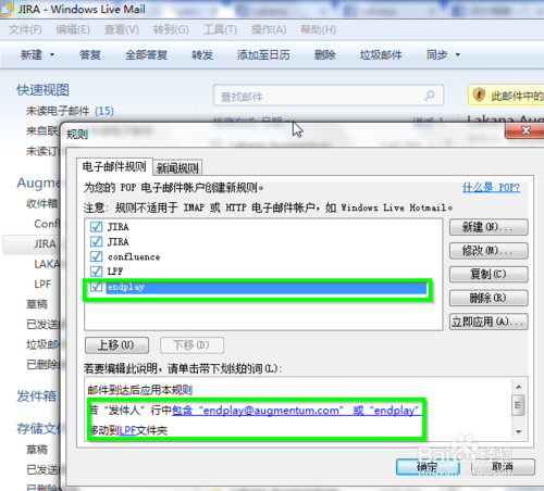 7、邮件规则已经新建并且配置成功啦, 以后收到的邮件就能被分到不同的文件夹中啦.