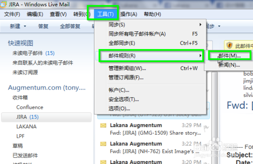6、邮件规则新建完成之后,就会默认使用了. 如果我们要查看有哪些邮件规则, 可以点击工具栏中的"工具"-->"邮件规则"-->"邮件",就可以查看到所有的邮件规则.