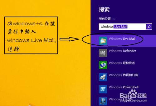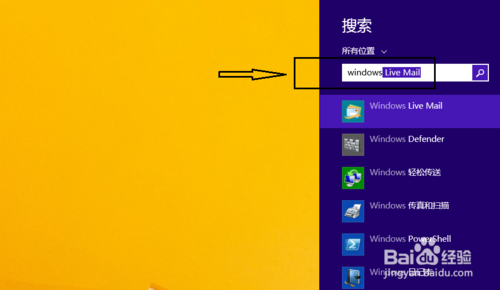 1、进入windows 8.1系统桌面,按快捷健windows+s,弹出如图的搜索栏,在搜索栏中输入windows live mail,打开windows live mail邮箱。