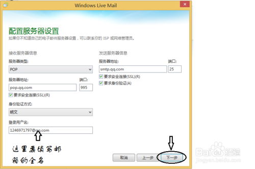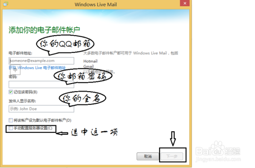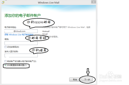 3、进入到添加你的电子邮件窗口中,按图标出提示填写,点下一步。