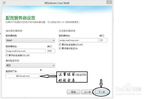 4、进入配置服务器设置窗口中,按图片上信息和提示填写。服务器类型:IMAP 接收服务器imap.mail.me.com 端口993, 发送服务器smtp.mail.me.com 端口25,选中要求安全连接(SSL),下一步。
