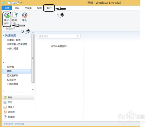 2、在windows live mail中先点帐户,在点添加电子邮件,按下图步骤做。